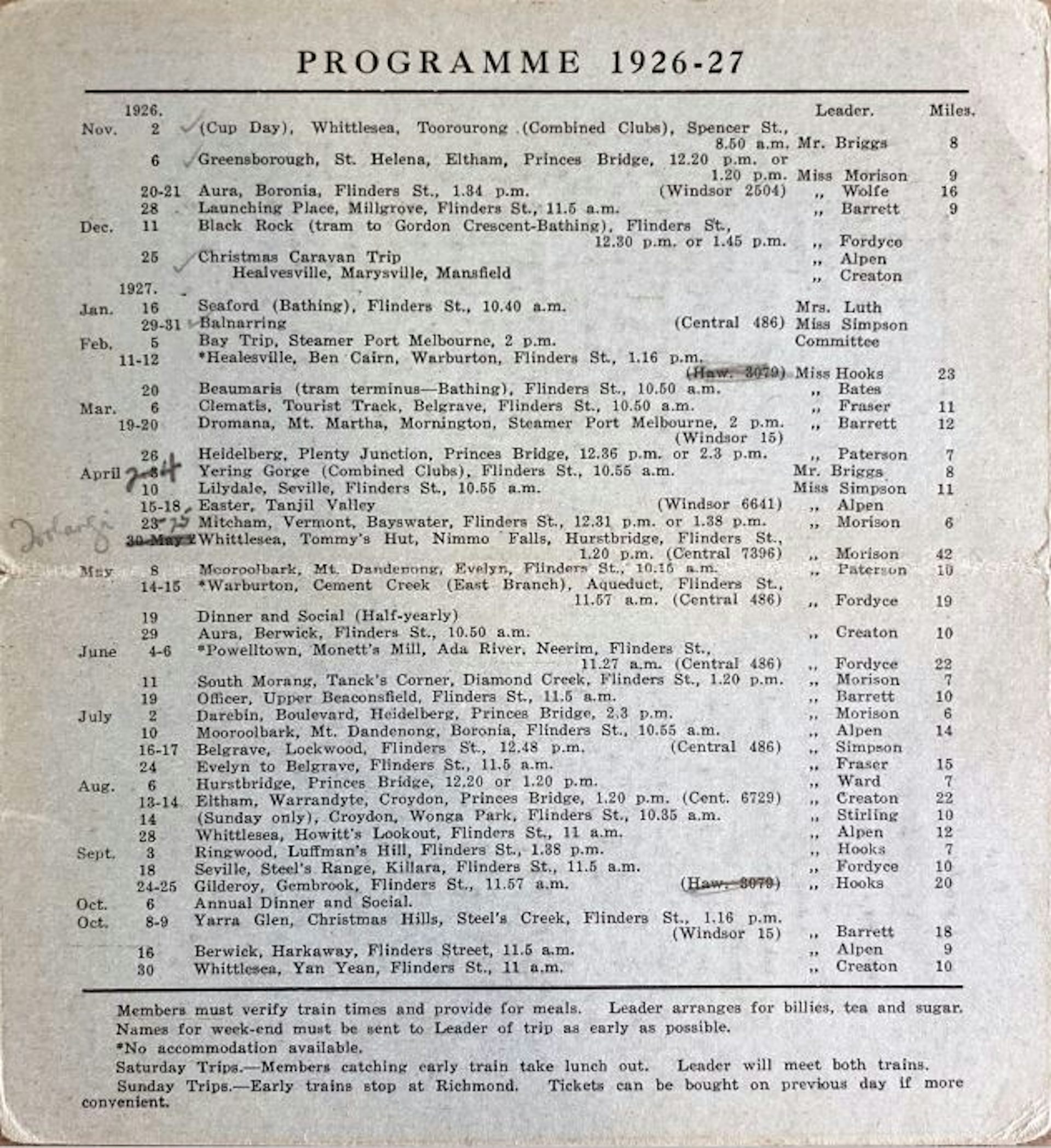 In a time before most women had access to cars, club members typically met at Flinders Street Station then took a train to the start of their hike. Walking destinations included Wilson’s Promontory, the You Yangs, Phillip Island, the Grampians, Anglesea and Mount Buller.